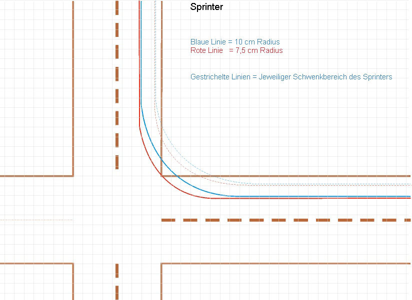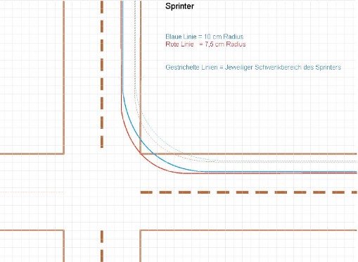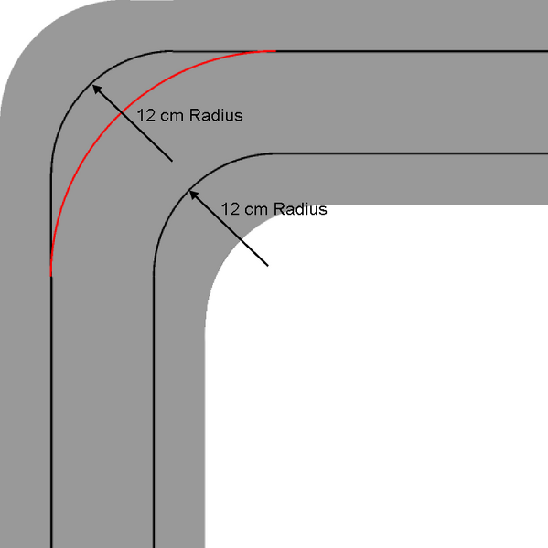 In beiden Richtungen wird in der Kurve ein Radius von 12 cm verwendet.