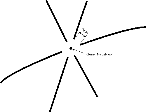 Hier sieht man den Verlauf der Drähte (schwarz markiert) und den kleinen Nagelkopf in der Mitte.