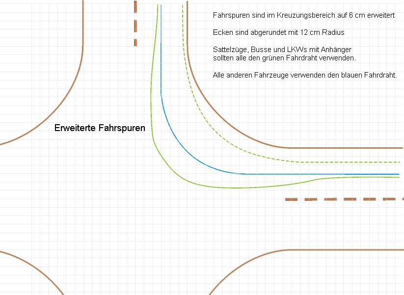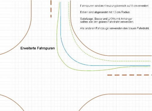 Dazu gibt es verschiedene Methoden. Die mir bekannten möchte ich hier aufzeigen und auch auf die Unterschiede eingehen. Nicht nur der Aufbau der Strasse ist wichtig, sondern auch die Verlegung der Trasse und die notwendigen Radien in Kurven und Kreuzungen. Jeder Fahrzeugtyp fährt anders um eine Kurve. Das ist bei der Planung der Strassen zu berücksichtigen. Ein Bus benötigt auf Grund seines langen Radstands und dem langen Vorbau viel mehr Platz in den Kurven als z.B. ein Sprinter. Ein Sattelzug benötigt auf der Innenseite einer Kurve viel mehr Platz als z.B. ein LKW. Ebenso verhält es sich bei einem LKW mit Anhänger. Um all diese Vorgaben im Strassenbau zu verwirklichen, bedarf es einiger Kompromisse. Eine generelle Maßtabelle für die Strassenbreite und der Abstand des Fahrdrahtes zueinander wird nicht zum gewünschten Erfolg führen. Eine Anlage mit Strassen, die überall die gleichen Radien haben, sieht nicht gut aus und entspricht auch nicht dem großen Vorbild. Ebenso ist es bei total geraden Straßen entlang der Anlagenkante.