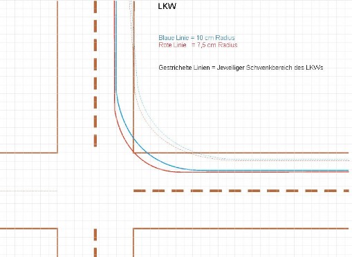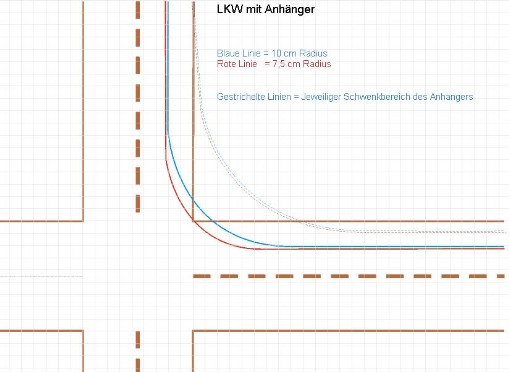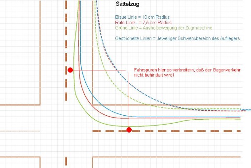 Für Lastwagen mit Anhänger oder Sattelzüge muss die Kurve wesentlich erweitert werden.