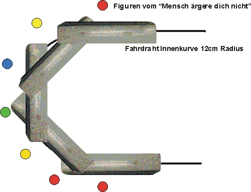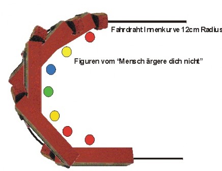 Jetzt werden auf der Innenseite der Kurve als Hilfsmittel Figuren vom "Mensch ärgere Dich nicht" Spiel so aufgestellt,