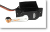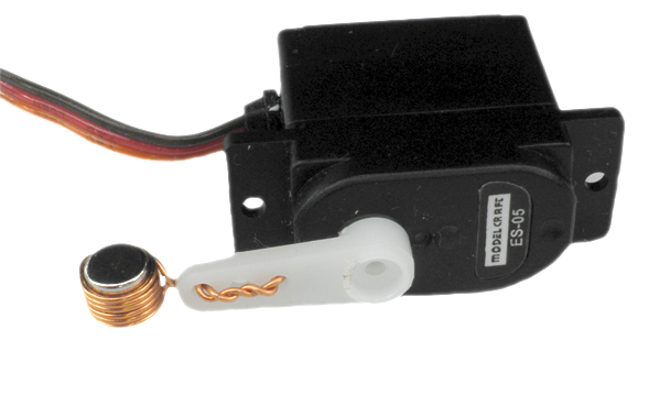 Eigenbau mit Servo: Dazu wird ein entsprechender Permanent-Magnet am Hebel eines Servos befestigt. Als Befestigung wurde der Magnet mit dickerem Kupferlackdraht umwickkelt und am Servoarm befestigt. Das Ganze wird noch mit Kleber stabilisiert. Das Servo wird so unter der Fahrbahn befestigt, dass bei obenliegenden Magnet das Fahrzeug ausgeschaltet wird.