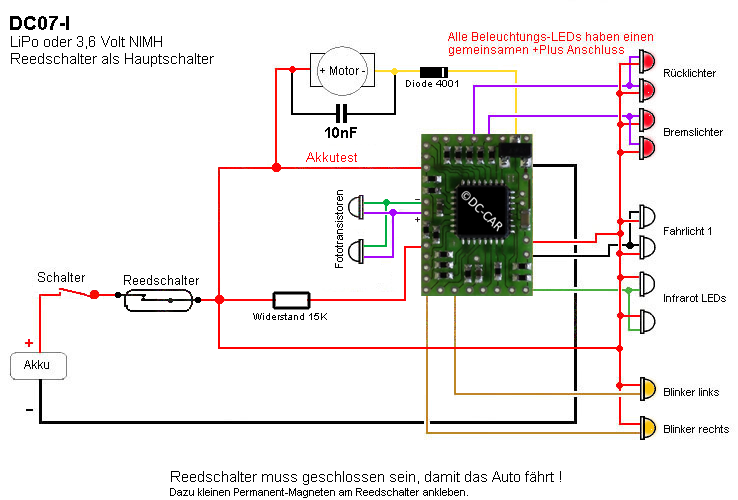 Wird der Reedkontakt wie auf dem Bild gezeigt verwendet, so bietet sich die Möglichkeit, die Fahrzeuge auf einem Parkplatz in einem Schattenbahnhof stromlos zu schalten. Wird ein DC-Car Fahrzeug "nur" angehalten (Infrarot-Stopp) so verbraucht der Decoder weiterhin Strom und der Akku entlädt sich mit der Zeit.