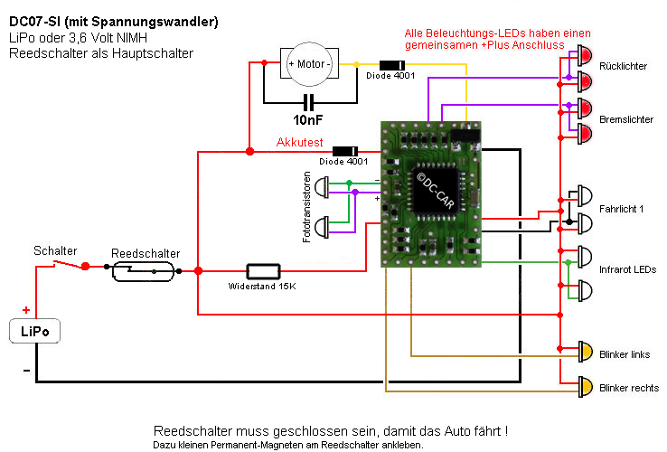 Wird der Reedkontakt wie auf dem Bild gezeigt verwendet, so bietet sich die Möglichkeit, die Fahrzeuge auf einem Parkplatz in einem Schattenbahnhof stromlos zu schalten. Wird ein DC-Car Fahrzeug "nur" angehalten (Infrarot-Stopp) so verbraucht der Decoder weiterhin Strom und der Akku entlädt sich mit der Zeit.