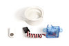 Eigenbau mit Servo: Dazu wird ein entsprechender Permanent-Magnet am Hebel eines Servos befestigt. Als Befestigung wurde der Magnet mit dickerem Kupferlackdraht umwickelt und am Servoarm befestigt. Das Ganze wird noch mit Kleber stabilisiert. Das Servo wird so unter der Fahrbahn befestigt, dass bei obenliegenden Magnet das Fahrzeug ausgeschaltet wird.