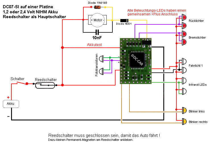 Wird der Reedkontakt wie auf dem Bild gezeigt verwendet, so bietet sich die Möglichkeit, die Fahrzeuge auf einem Parkplatz in einem Schattenbahnhof stromlos zu schalten. Wird ein DC-Car Fahrzeug "nur" angehalten (Infrarot-Stopp) so verbraucht der Decoder weiterhin Strom und der Akku entlädt sich mit der Zeit.