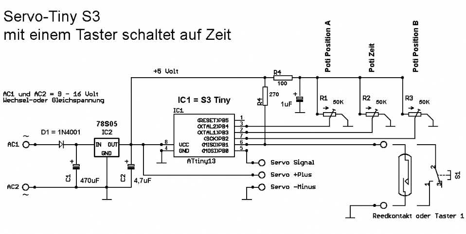 Der S3-Servo Tiny kann selbst auf einer Lochraster-Platine aufgebaut werden. Entweder wird nur der Chip bestellt oder ein Bausatz mit allen Teilen. Die Verkabelung ist an Hand des Schaltplanes selbst durchzuführen.