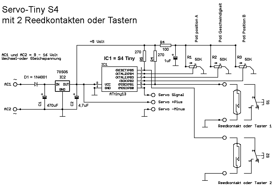 Der S4-Servo Tiny kann selbst auf einer Lochraster-Platine aufgebaut werden. Entweder wird nur der Chip bestellt oder ein Bausatz mit allen Teilen. Die Verkabelung ist an Hand des Schaltplanes selbst durchzuführen.