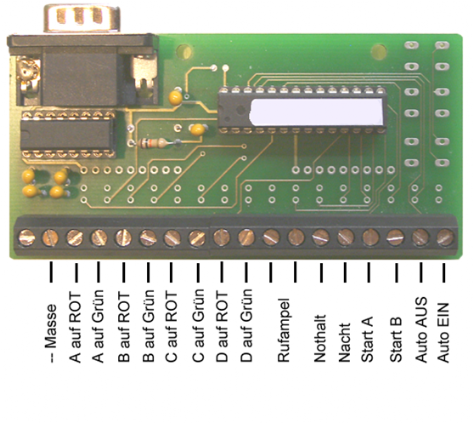 Durch Aufstecken der Schaltervorsatzplatine können die Ampeln über Taster, Schalter, Reedkontakte und Hallsensoren beeinflusst oder gesteuert werden. Auf dem linken Bild sind die jeweiligen Funktionen gezeigt, die durch Kontakt mit dem „Masse“-Anschluss ausgelöst werden.