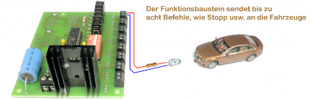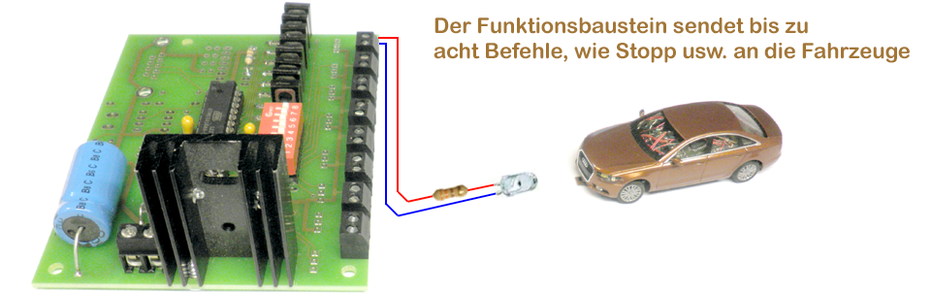 Es wird nur der Funktionsbaustein, ein paar Infrarot-LEDs und Widerstände benötigt. Die benötigten acht Befehle werden über den Klavierschalter eingestellt. Die Entfernung, bei der ein Fahrzeug den Befehl erkennt, wird über den Widerstand eingestellt. Je größer der Widerstand, desto kleiner ist die Entfernung.