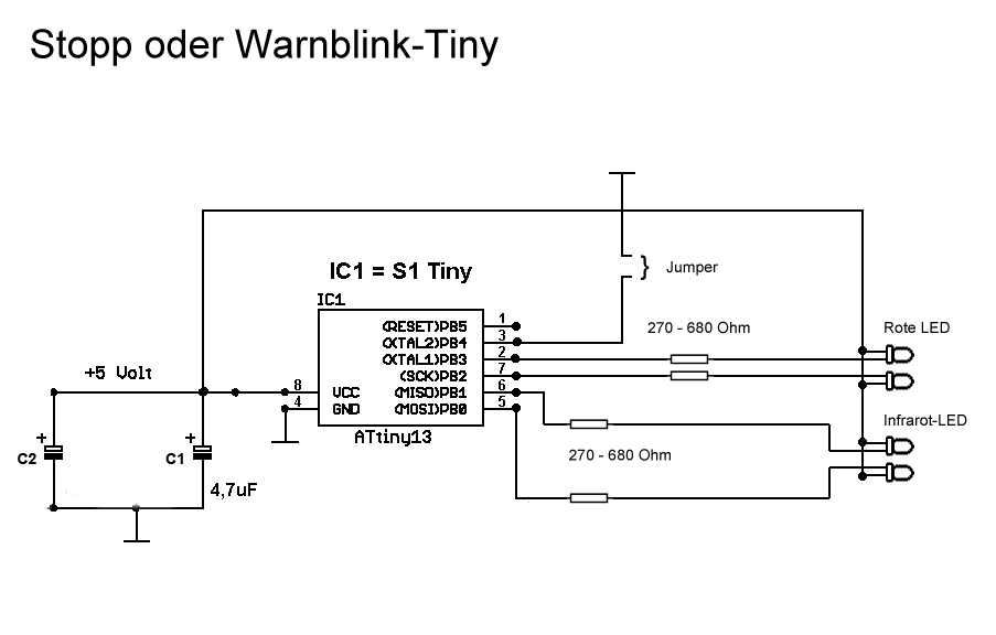 Beide Tiny senden konstant ein Infrarot-Stoppsignal an zwei Ausgängen aus. An diese Ausgängen werden Infrarot LEDs mit den jeweiligen Vorwiderständen angeschlossen.