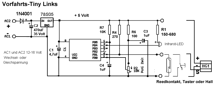 Wird der Baustein direkt mit 5 Volt Gleichspannung versorgt, so können die Bauteile D1, 78S05 und C2 weggelassen werden.