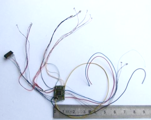 Auf dem Bild ist der BUS-Set mit DC07-SI mit Rückleuchtenträger und Updatebuchse zu sehen. Angelötete Blinker und Scheinwerfer vorne. Angelötete Blinker, Bremslicht und Rücklicht hinten.